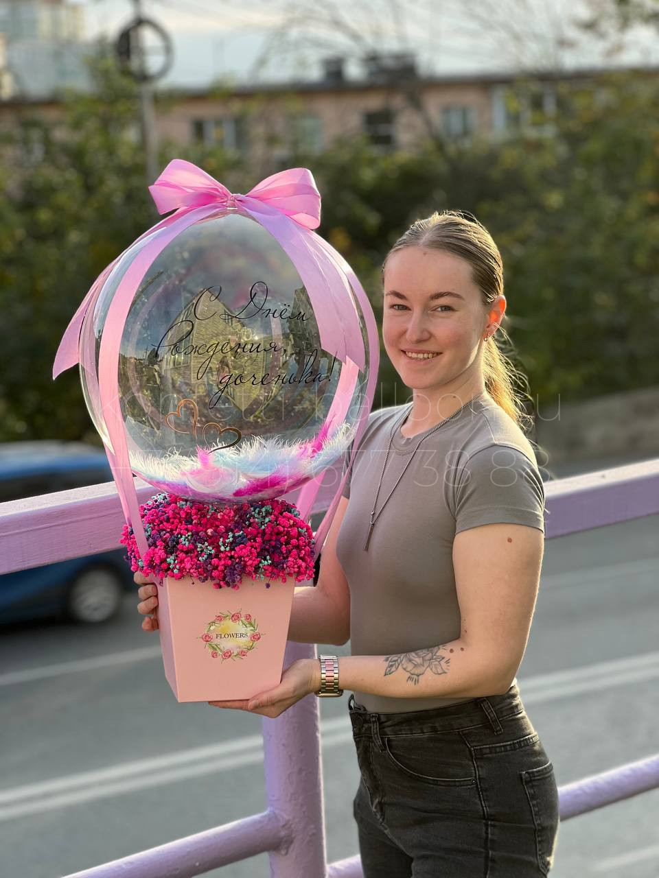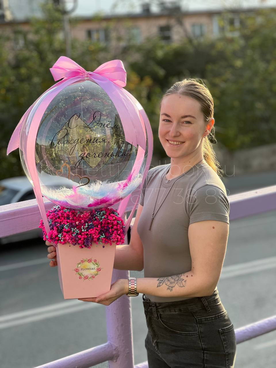 Бокс с гипсофилой и шаром Bubbles с перьями и индивидуальной надписью – роскошный подарок на день рождения, свадьбу, выпускной, который не оставит равнодушным совершенно никого.