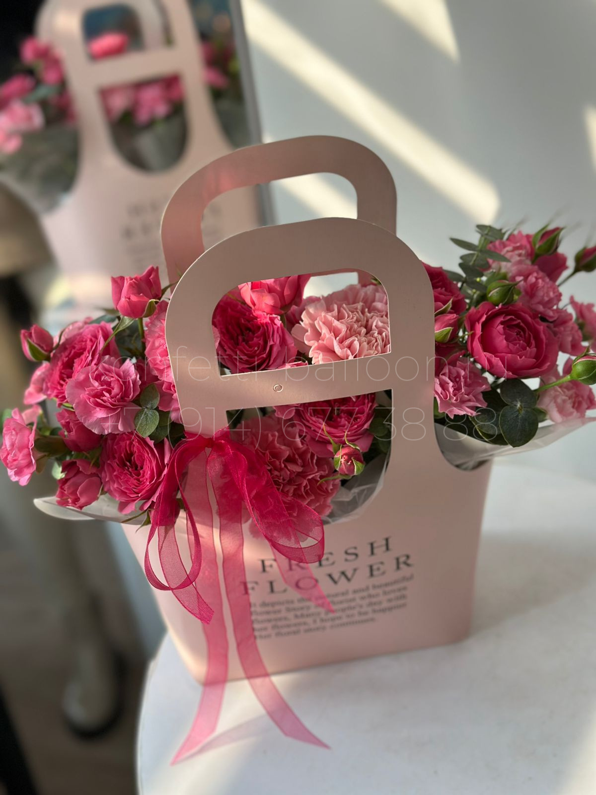 В состав «Бокс с миксом цветов в коробке сумочке» входит: