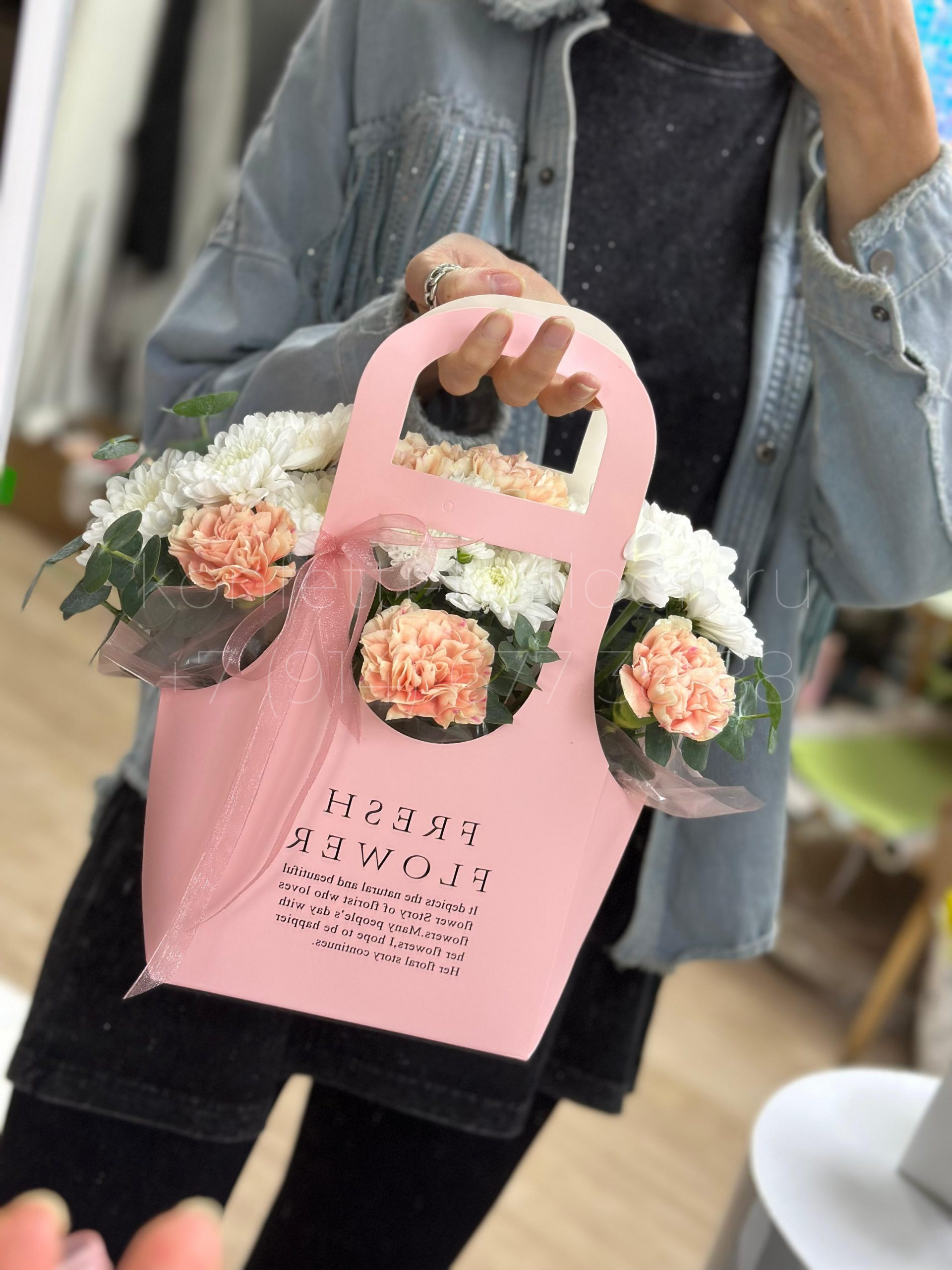В состав «Бокс с миксом цветов в коробке сумочке» входит: