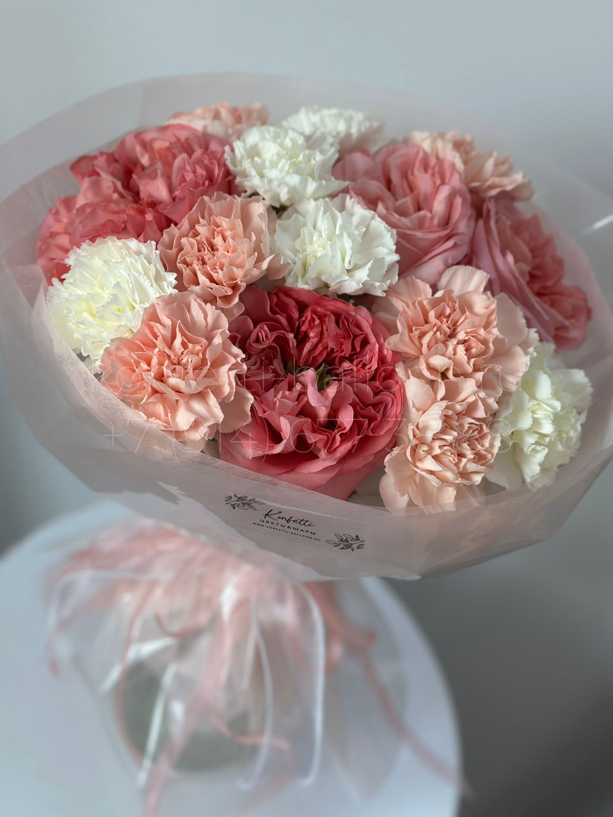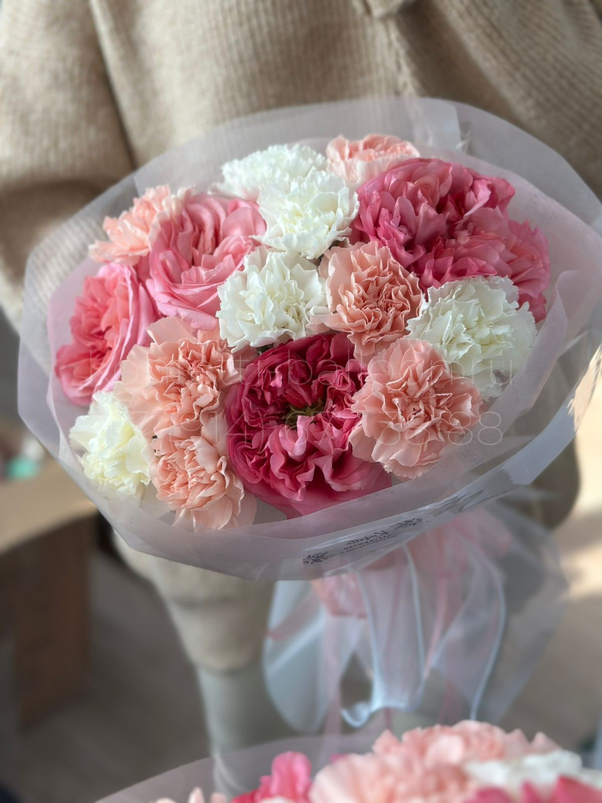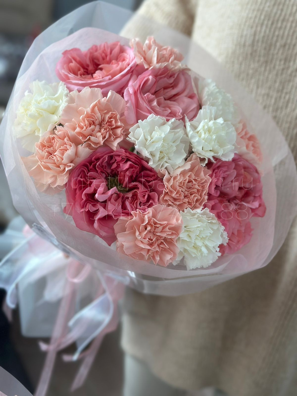 Букет цветов из пионовидной розы и диантусов