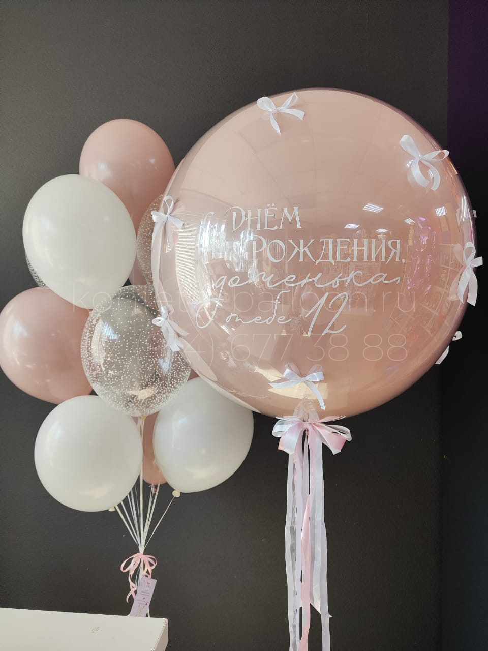 Шар гигант 60-65 см в стеклянной технике и индивидуальной надписью, с дополнительным декором бантики из атласной ленты