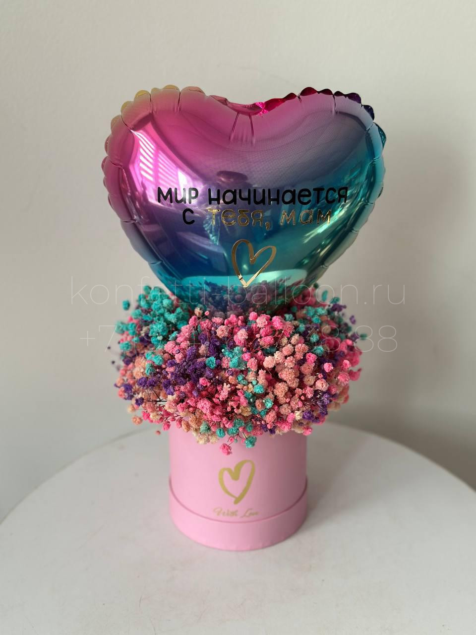 Мини-бокс с гипсофилой и фольгированным сердцем – что может быть еще прекраснее в подарок по особому случаю, на День Мамы, день рождения или просто так.