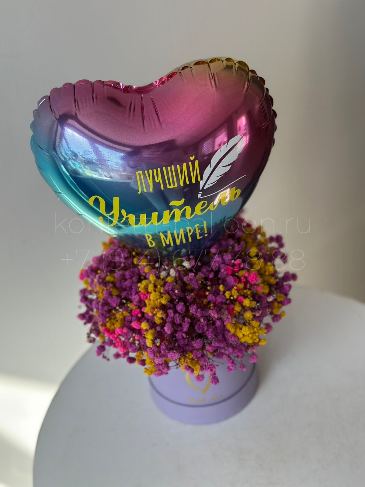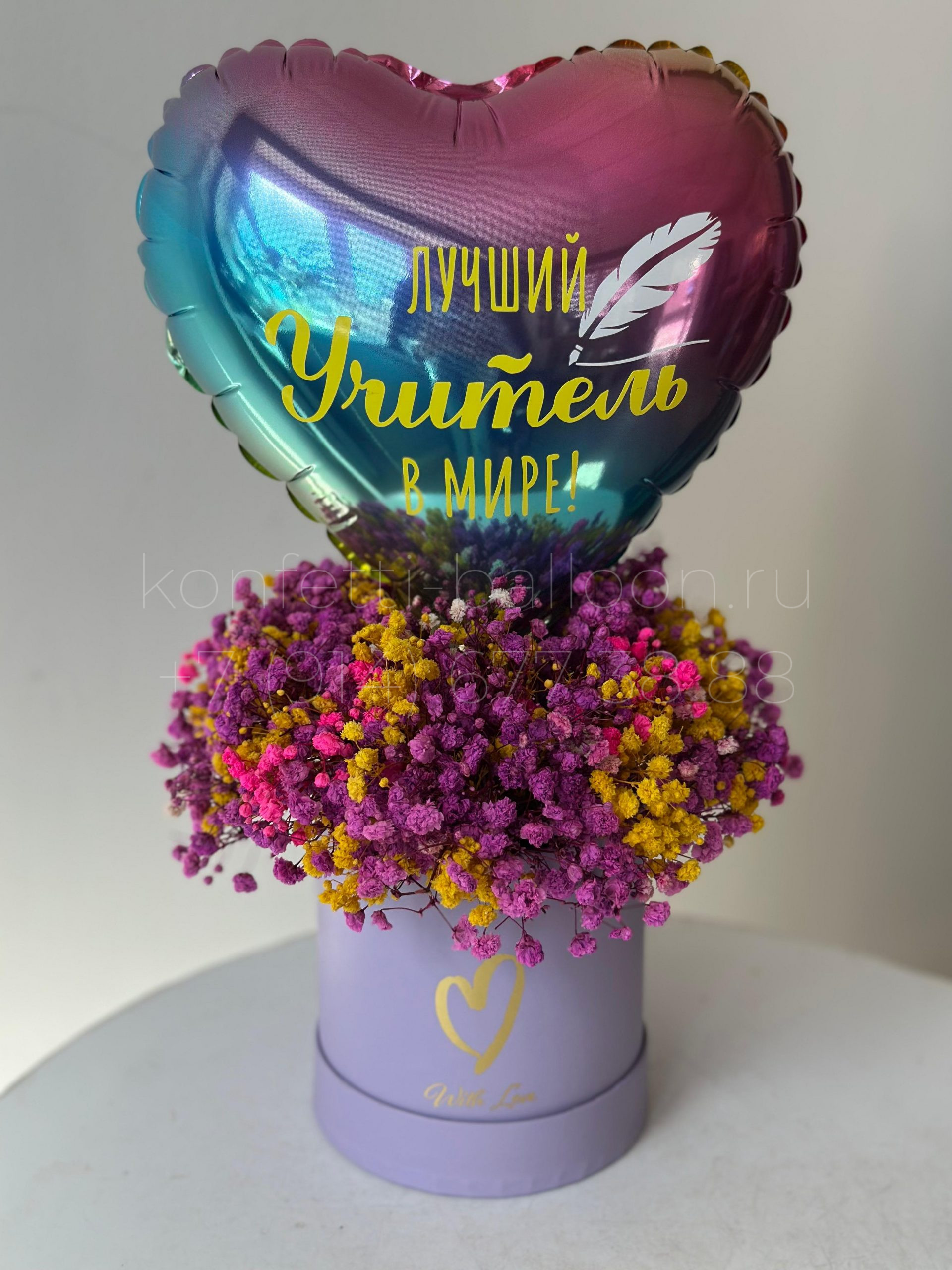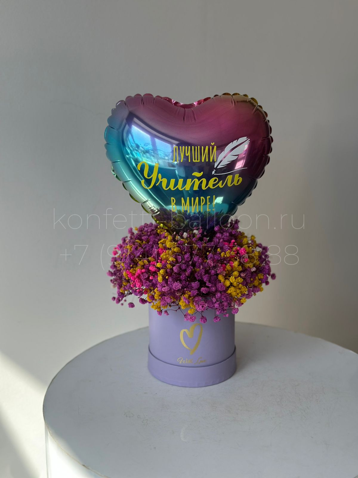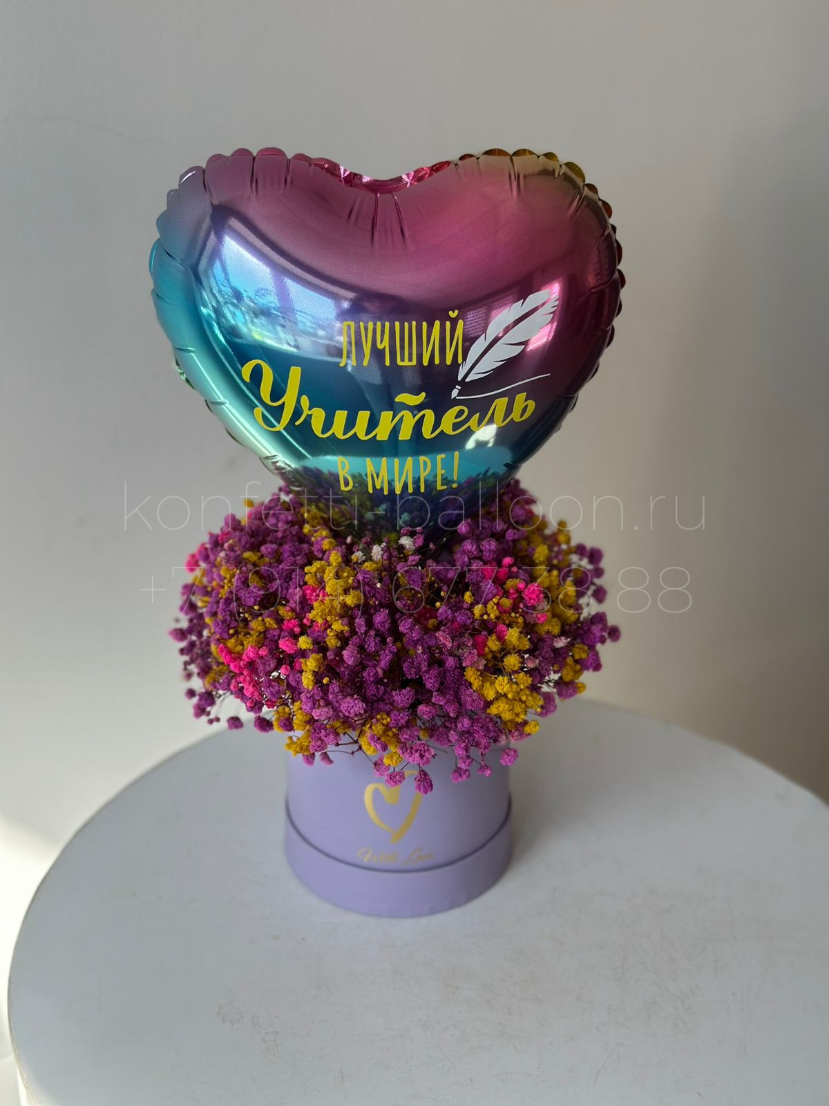 Мини-бокс с гипсофилой и фольгированным сердцем – отличный подарок или комплимент на последний звонок, выпускной, на день знаний или на день учителя для преподавателя или учителей
