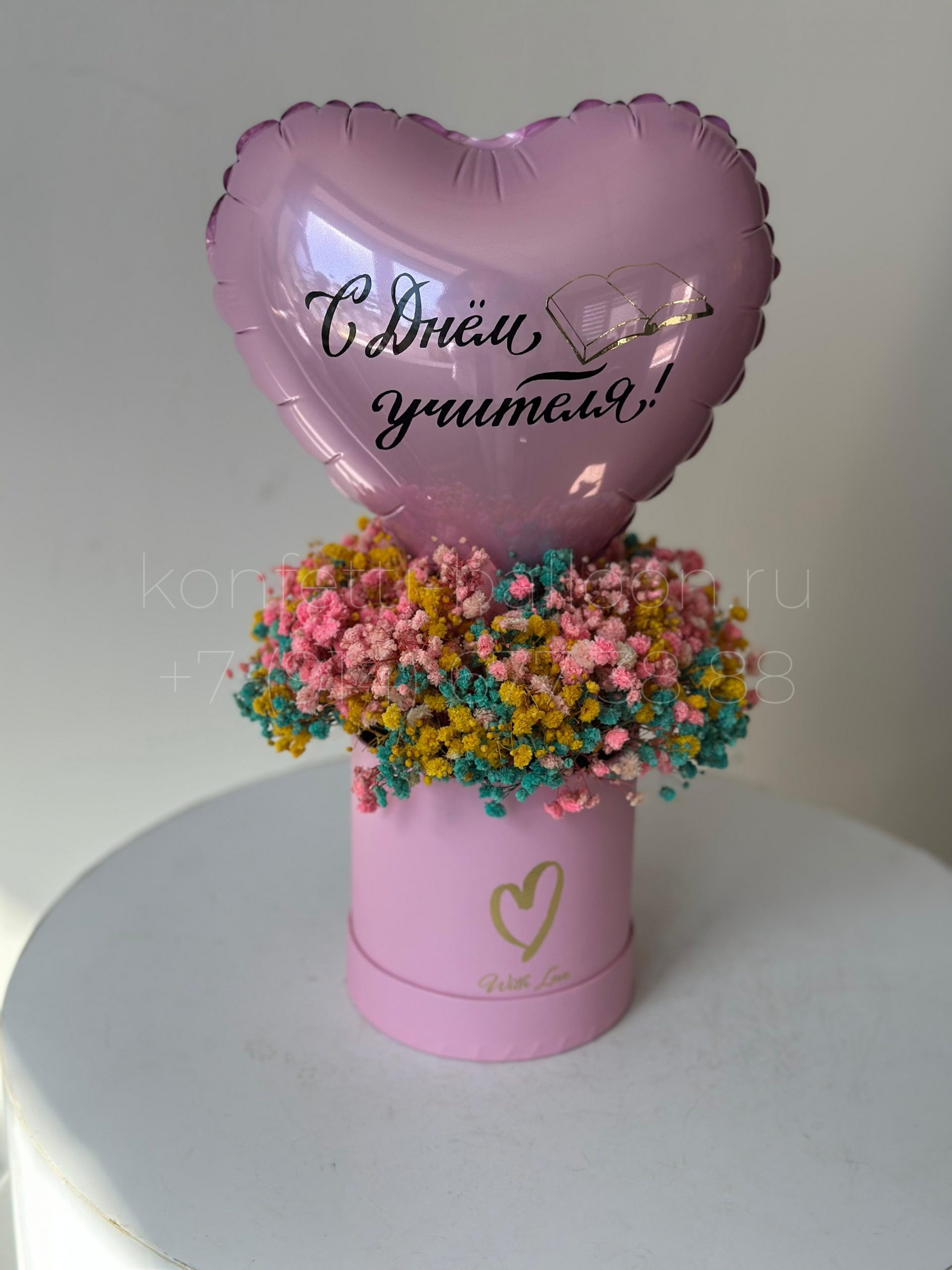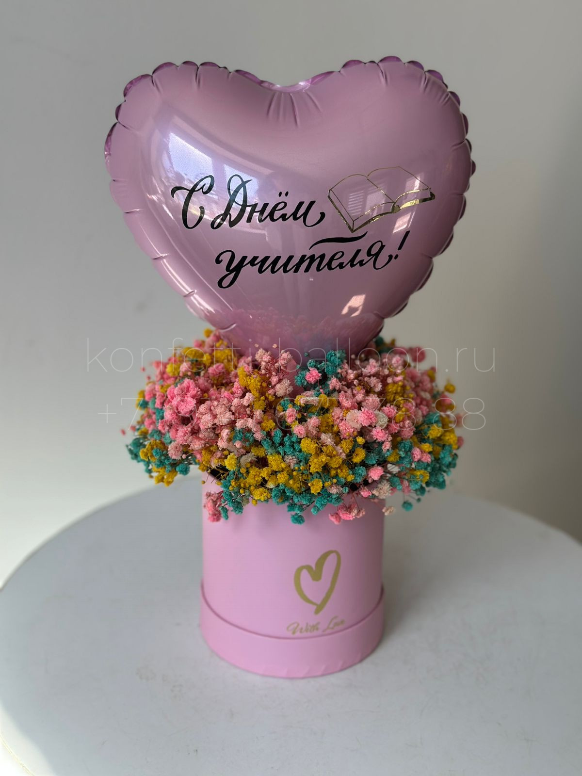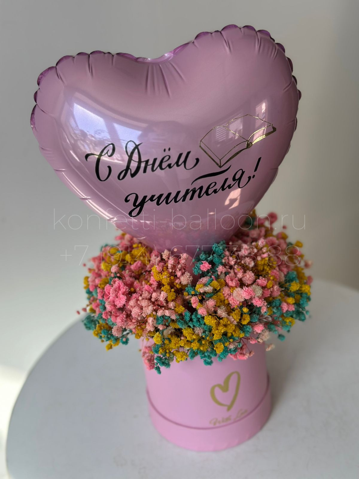 Мини-бокс с гипсофилой и фольгированным сердцем – отличный подарок или комплимент на день учителя для преподавателя или учителей